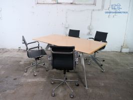 Aan deze tweedehands vergadertafel, van het merk Ahrend, kunt prettig overleg voeren. De tafel is voorzien van een mooi peren hout blad op een RVS frame. Deze vergadertafel is 73 cm hoog, 200 cm breed en 100 cm diep. Let op: de tafel heet lichte gebruikssporen en verkleuringen (niet storend)