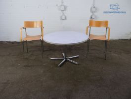 Dit gebruikte bijzettafeltje is niet alleen functioneel, maar ook een stijlvolle aanvulling op uw interieur. Perfect voor in een wachtruimte als lectuurtafel, maar ook thuis zal deze tafel zeker niet misstaan. Het blad is verkrijgbaar in diverse kleuren uit ons ruime assortiment (let op: langere levertijd), zodat u het kunt afstemmen op uw persoonlijke voorkeur of de sfeer van de ruimte. Het tafelblad rust op een stevig chromen 5-voet frame, wat zorgt voor een moderne en stabiele basis. Dit tweedehands tafeltje heeft een hoogte van 52 cm en een diameter van 100 cm. Let op: het grijze blad op de foto is een showmodel en dient als voorbeeld.