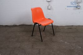 Kantinestoel – Oranje Kunststof Kuip, Zwart Frame, Stapelbaar, Zonder Armleuningen, Tweedehands