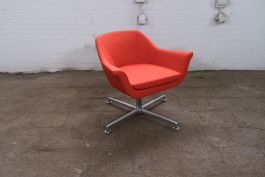Deze tweedehands draaifauteuil biedt een perfecte balans tussen comfort, functionaliteit en elegant design. De rode stoffering in combinatie met de chromen draaipoot geeft de stoel een moderne, warme uitstraling die zowel in een thuisomgeving als in een kantoorruimte uitstekend tot zijn recht komt. Dankzij de comfortabele armleuningen en het draaibare onderstel is deze fauteuil niet alleen stijlvol, maar ook bijzonder praktisch in gebruik.