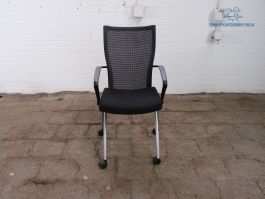 Deze mooie tweedehands design vergaderstoel, van het merk Haworth comforto, biedt een fijne zitplek voor u en uw collega's tijdens een vergadering of presentatie. De zitting is bekleed met een zwart gemêleerd stof en de rugleuning is van zwart mesh. De stoel heeft een zilvergrijs aluminium frame en is m.b.v. wieltjes verrijdbaar. Deze is ook voorzien van armleuningen. De stoel is niet stapelbaar, wel nestbaar, zie foto.