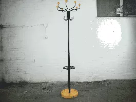 Op deze tweedehands kapstok kunnen voortaan de jassen netjes opgehangen worden. Deze gebruikte kapstok is van zwart metaal met totaal 16 haakjes, waaronder bovenste haakjes zijn afgewerkt met houten balletjes (let op: mist 1 balletje, zie foto). De kapstok is voorzien van parapluhouder en is 184 cm hoog. Verder verkeert deze gebruikte kapstok in zeer goede staat.