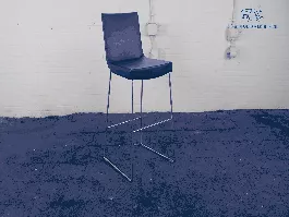 U kunt op deze kruk comfortabel aan een bar of hoge tafel zitten. De zitting en rugleuning zijn van blauw PU kunstleer met een design verchroomd sledeframe. De kruk heeft voetensteun voor en achter en verkeert in goede conditie met hier een daar kleine schuifplekjes, niet storend.