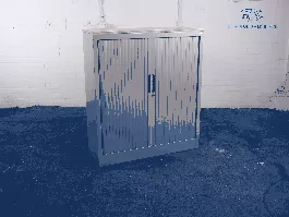 U kunt uw spullen netjes en veilig opbergen in deze gebruikte roldeurkast van het merk Mibra. Deze tweedehands kast is grijs van kleur en heeft een eikenhout topblad. Deze roldeurkast is voorzien van 2 legborden. De afmetingen van de kast zijn 102 cm hoog, 100 cm breed en 45 cm diep. De kast wordt standaard geleverd zonder sleutel, deze kunnen we uiteraard wel voor u bij bestellen.
