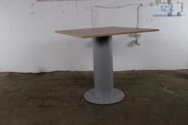 Deze nette tweedehands statafel is voorzien van een vierkant robson eiken blad op een lichtrijze ronde poot. De afmetingen van deze tafel zijn 113 cm hoog, 120 cm breed en 120 cm diep.