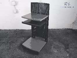 Deze gebruikte lezenaar heeft een geperforeerde antraciete voorkant en is voorzien van 3 werk bladen van kersen/ antraciet kleur. Deze lezenaar is verrijdbaar, en de bladen zijn verschuifbaar. De afmetingen zijn 107 cm hoog, 54 cm breed en 60 cm diep.