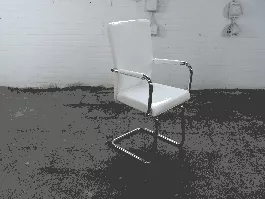Deze nette tweedehands vergaderstoel biedt een stijlvolle en comfortabele zitervaring, perfect voor vergaderingen, conferenties of als extra zitplaats in een professionele omgeving. Het strakke ontwerp in combinatie met het wit PU leder zorgt voor een moderne uitstraling, terwijl het verchroomde sledeframe en de armleuningen een industriële touch toevoegen. Deze stoel biedt zowel comfort als een verfijnde look voor uw vergaderruimte.