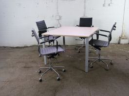 Deze tweedehands vierkante vergadertafel biedt een comfortabele en stijlvolle plek om te vergaderen of samen te werken met collega’s. Het eiken blad geeft de tafel een warme en natuurlijke uitstraling, terwijl het zilvergrijze frame onder het blad zorgt voor een moderne en functionele ondersteuning.