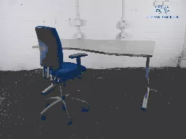 U kunt prettig zitten werken aan dit tweedehands wingbureau. Het bureau is voorzien van een beuken blad, met de wing aan de rechterkant. De afmetingen van het blad zijn 180 cm breed en 100/80 cm diep. Hieronder zit een zilvergrijs frame, dat handmatig in hoogte verstelbaar is.